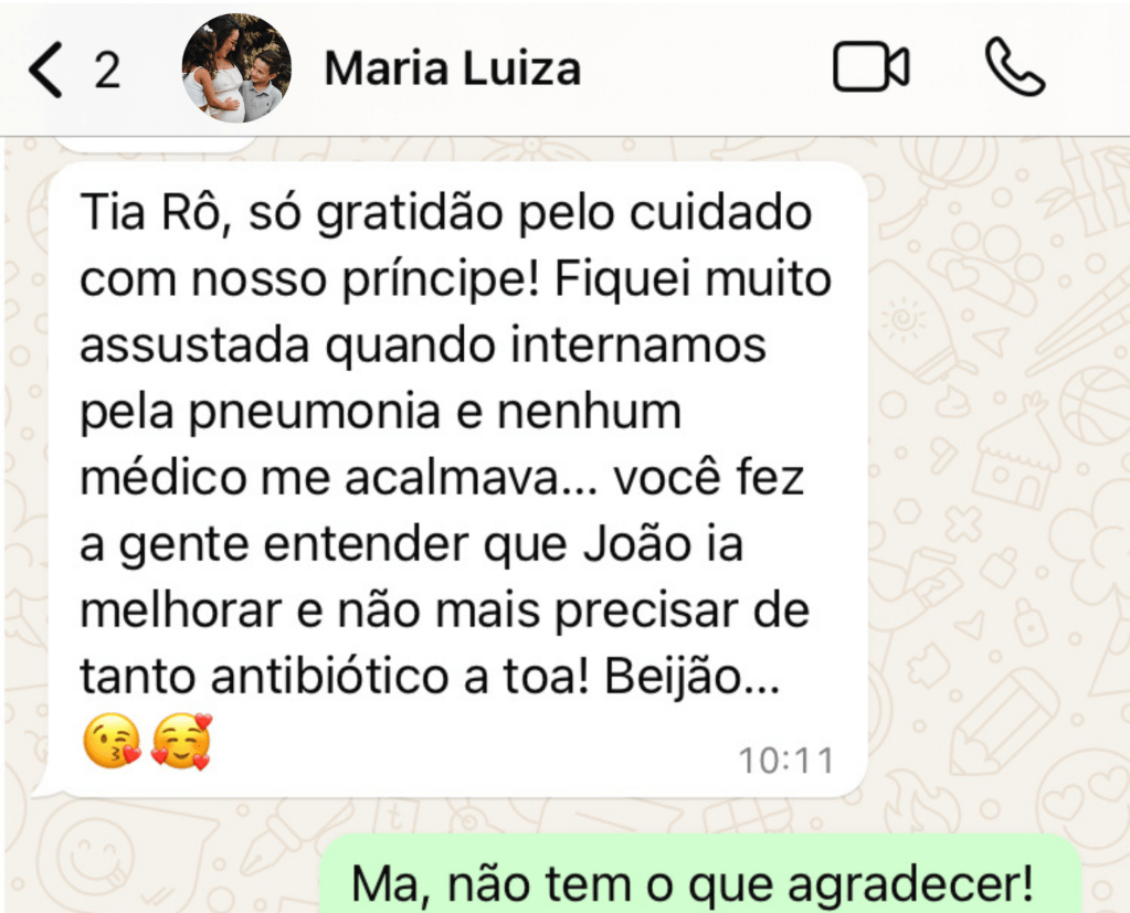 Eu sou a Dra. Roberta, formei-me em medicina em 2014 pela Universidade do Vale do Sapucaí e me apaixonei pelo mundo das crianças neste trajeto. Fiz residência médica em Pediatria pelo Hospital das Clínicas Samuel Libânio, em Pouso Alegre/MG, e residência em Pneumologia Pediátrica pelo Hospital Santa Casa de Misericórdia de São Paulo.